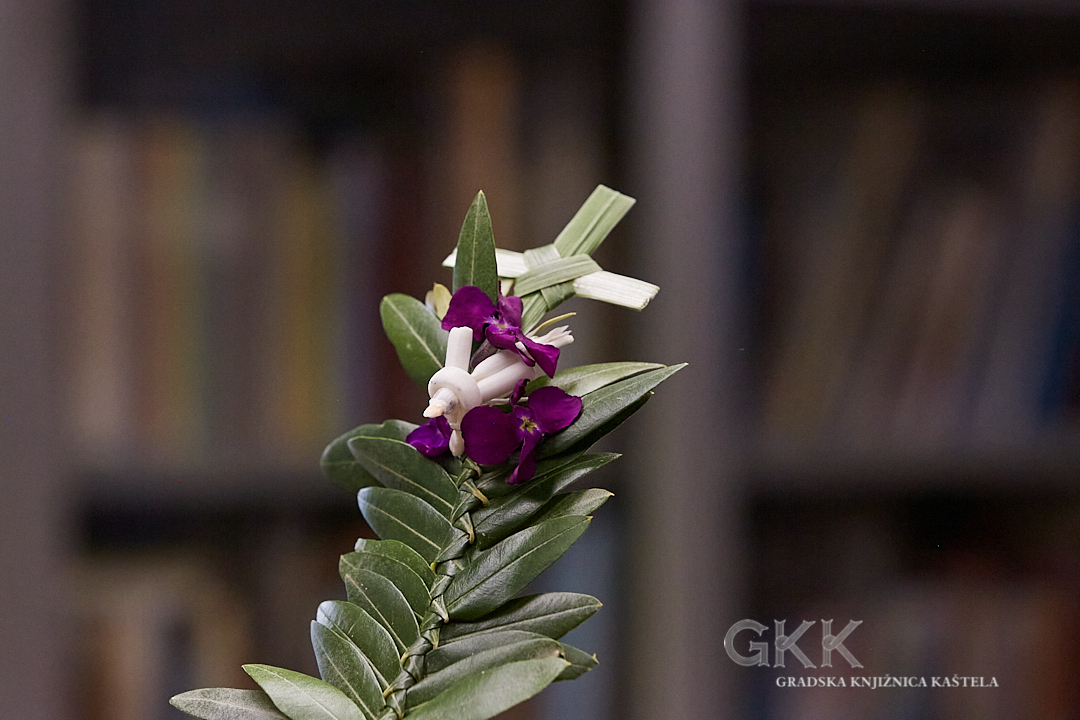 Čestitamo Vam Uskrs predivnom upletenom maslinovom grančicom! Upletena maslinova grančica izrađena je na tradicionalnoj uskrsnoj radionica pletenja maslinovih grančica i izrade golubica od srčike divlje smokve u organizaciji Gradske knjižnice