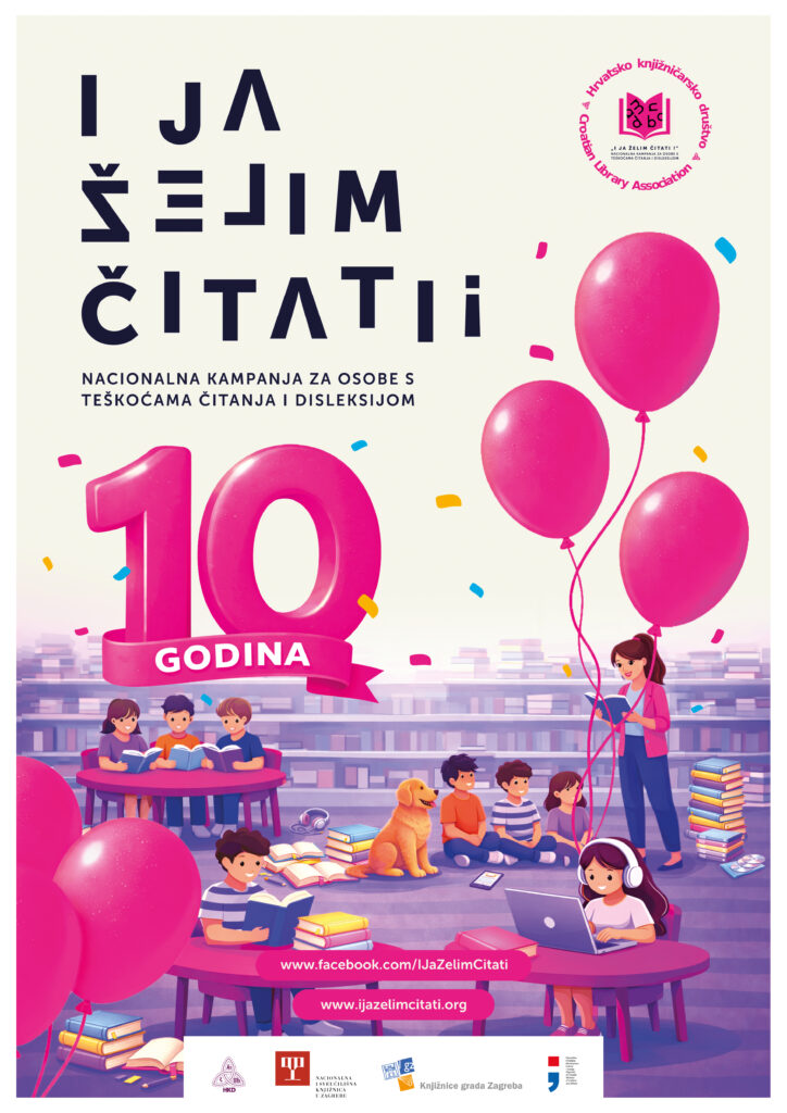 Pozivamo Vas na inkluzivno događanje „I ja želim čitati – čitamo jedni za druge“, koje organiziramo u sklopu Nacionalne kampanje za osobe s teškoćama čitanja i disleksijom „I ja želim čitati!“, povodom manifestacije Noć knjige 2026. te u godini obilježavanja 10. obljetnice Kampanje (2016. – 2026.). Program događanja odvijat će se u auli Nacionalne i sveučilišne knjižnice u Zagrebu u četvrtak 23. travnja 2026. od 15:15 do 17:00 sati.
