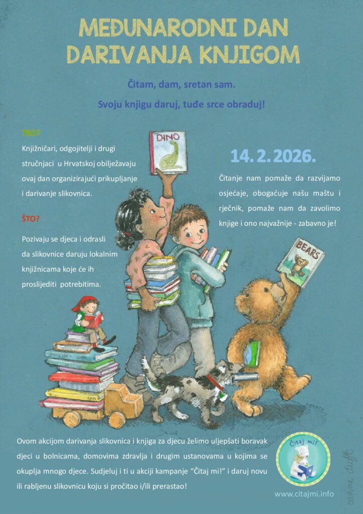 Pozivamo vas i na obilježavanje Međunarodnog dana darivanja knjigom (14. 2. 2026.). Svoje aktivnosti, osim na svojim mrežnim kanalima, mogu najaviti putem internet stranice kampanje “Čitaj mi!” https://www.citajmi.info/