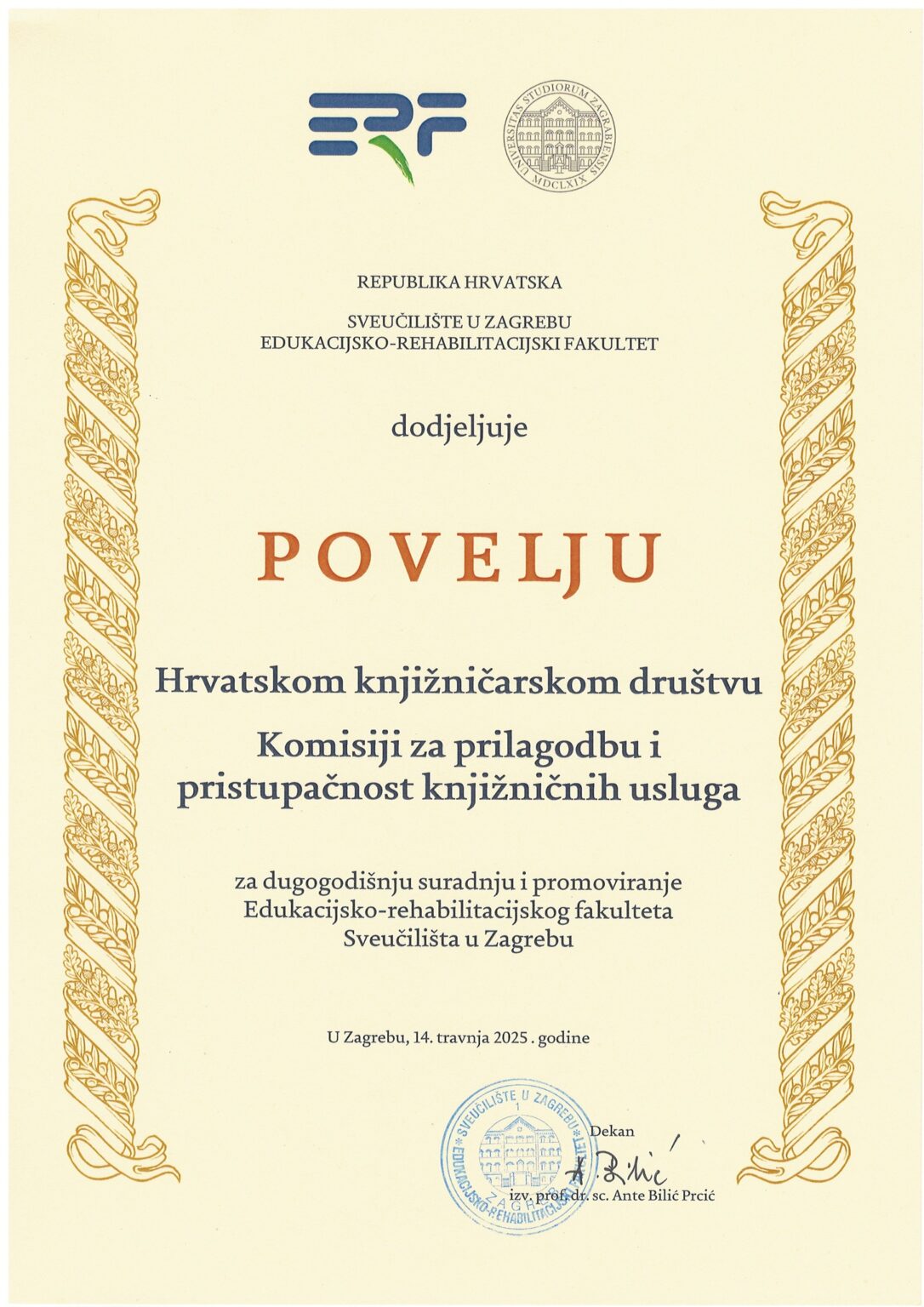 Pročitajte višePovodom obilježavanja 63. obljetnice osnutka Edukacijsko-rehabilitacijskog fakulteta 14. travnja 2025. Anita Malkoč Bišćan, viša knjižničarka i predsjednica Komisije za prilagodbu i pristupačnost knjižničnih usluga Hrvatskoga knjižničarskog društva, u ime Hrvatskoga