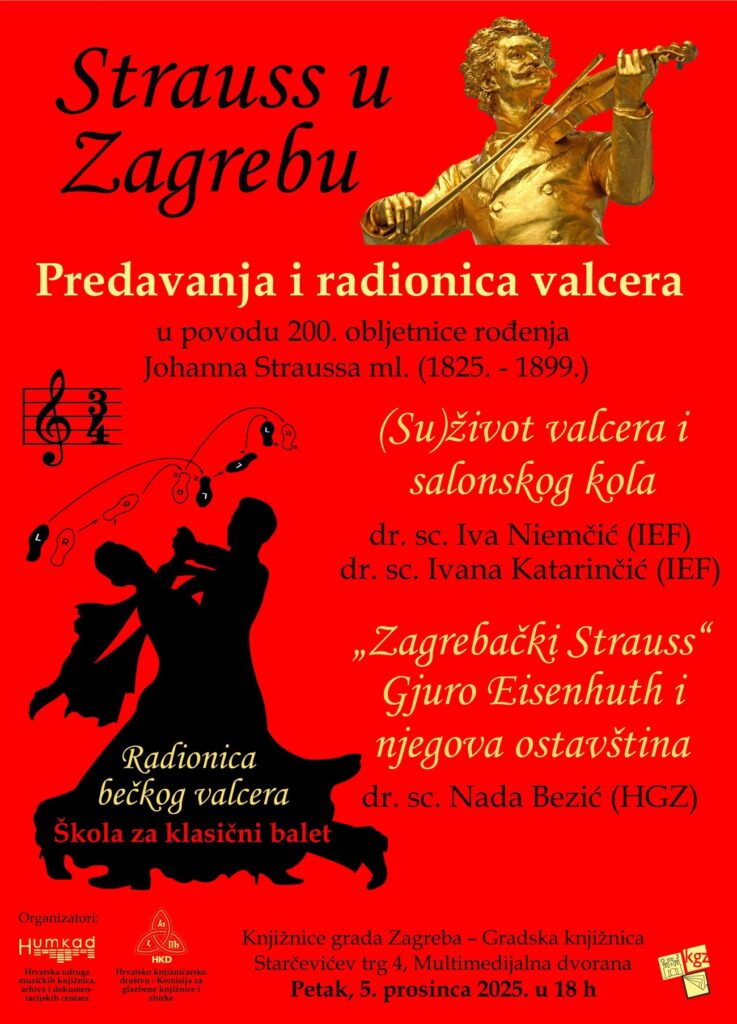 U petak, 5. prosinca 2025. s početkom u 18 h u Multimedijalnoj dvorani, Starčevićev trg 6, Knjižnice grada Zagreba – Gradska knjižnica, Hrvatska udruga muzičkih knjižnica, arhiva i dokumentacijskih centara (HUMKAD) i Komisija za glazbene knjižnice i zbirke Hrvatskoga knjižničarskog društva u povodu 200. obljetnice rođenja Johanna Straussa ml. (1825. – 1899.) organiziraju multimedijalno interaktivno događanje Strauss u Zagrebu.